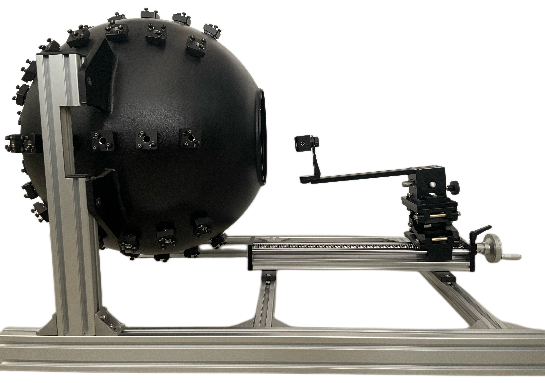 定制頻閃光纖積分球系統(tǒng),用于成像相機(jī)的成像視角定標(biāo),同時(shí)也可以用于評(píng)價(jià)成像的幀頻。系統(tǒng)包含內(nèi)壁全黑無(wú)反射積分球,頻閃LED光源盒及控制軟件。由積分球球壁等角度向球心發(fā)射準(zhǔn)直光束,每一束準(zhǔn)直光光斑直徑2mm,發(fā)散角較小,且亮度和閃爍頻率可調(diào)。