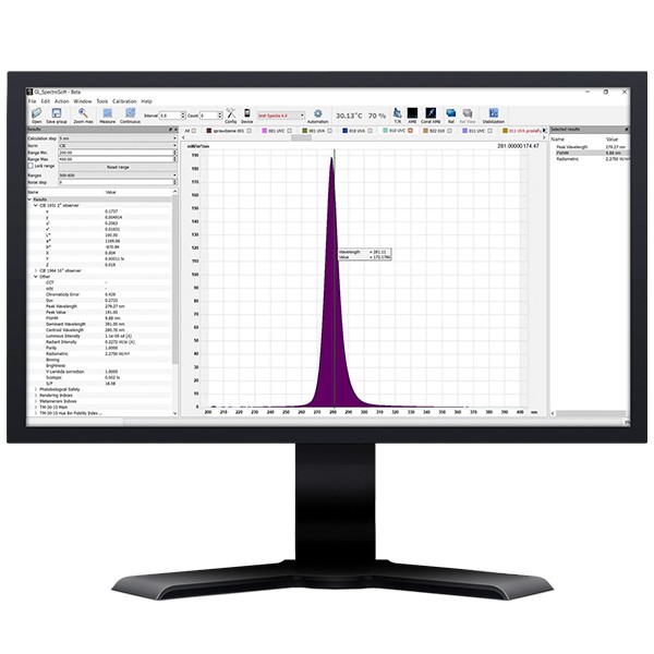 GL Spectis 4.0的可用光譜工作范圍從200nm開始,直***1050nm。專用的熱調(diào)節(jié)功能可在高達35°C的不同應(yīng)用溫度下穩(wěn)定讀數(shù)。由于進行了正確的校準,因此**UV光譜值不受雜散光的影響。波長和線性校正使用光具座進行驗證。**讀數(shù)與黑體輻射標準完全吻合,并用氘燈檢查紫外線范圍是否短。 GL Specis 4.0的UV和IR測量可以填補各種新型LED應(yīng)用的空白。