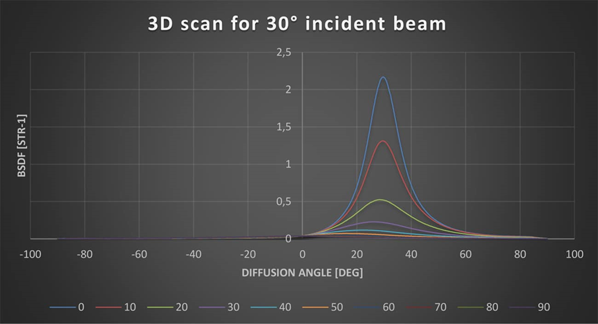 為了提高測量速度和精度,特別為裝置開發(fā)了測控軟件,支持多種幾何條件下散射特性一次性自動測量。首先進行光源入射輻亮度測量,而后對樣品漫射板設定幾何條件反射輻亮度進行測量,如此循環(huán)直***完成所有設定幾何條件的散射特性測量為止,軟件直接輸出散射特性曲線。